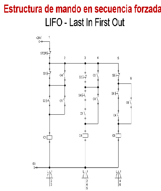 El ciclo de mando en secuencia forzada LIFO (Last In First Out) establece un orden fijo de activación de actuadores, desde el primero al ultimo, y luego en el momento de inactividad, exige el proceso inverso, el primero en desactivar es el ultimo en ser activado, y así sucesivamente hasta desactivar el primero. En caso de querer romper la secuencia el sistema no debe permitir la activación, y de igual forma en el momento de intentar romper la secuencia de inactivación los actuadores no deben desactivarse.
