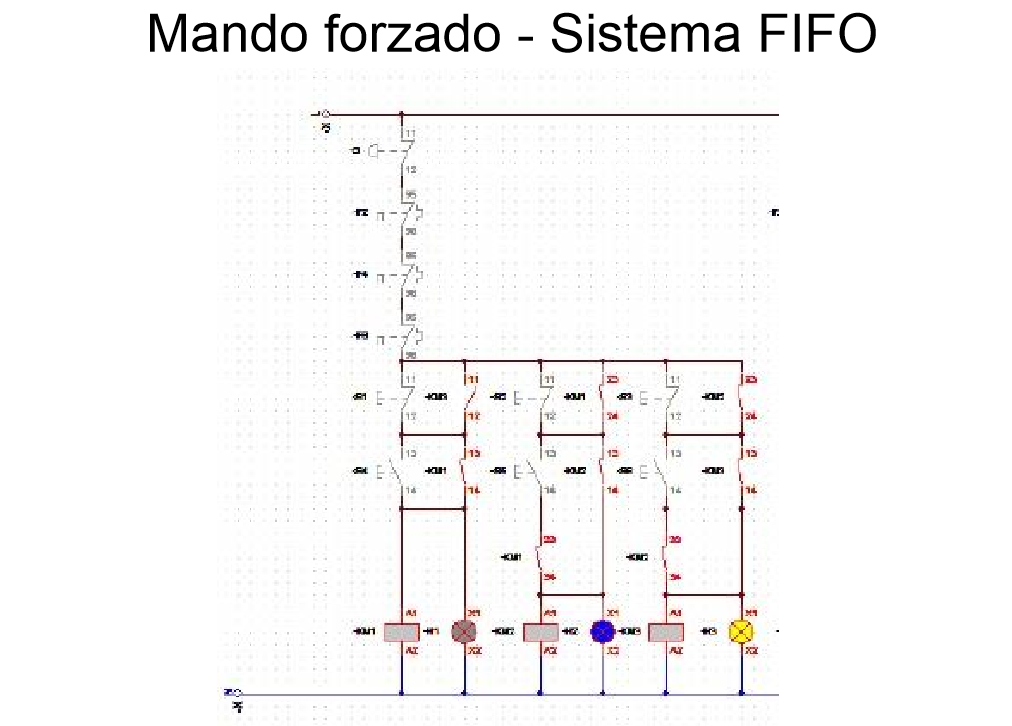 El ciclo de mando en secuencia forzada FIFO (First In First Out) establece un orden fijo de activación de actuadores, desde el primero al ultimo, y luego en el momento de inactivarlos, primero se desactiva el primer actuador, luego el segundo y así sucesivamente hasta desactivar el ultimo. En caso de querer romper la secuencia el sistema no debe permitir la activación, y de igual forma en el momento de intentar romper la secuencia de inactivación los actuadores no deben desactivarse.